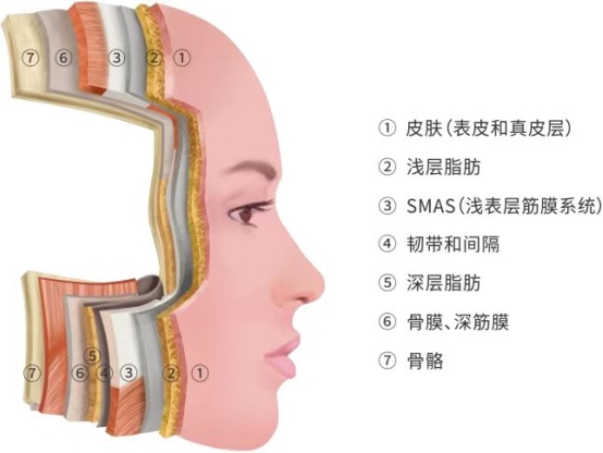 上了年纪后从上部边界和两个外侧开始下降,颧突下降至扁平,再加上我们中面部的表情通常是上提的,因此出现和下降组织对抗的上提张力,从而泪沟附近软组织缺失,法令纹就加深了,因此带来的衰老感也越重。